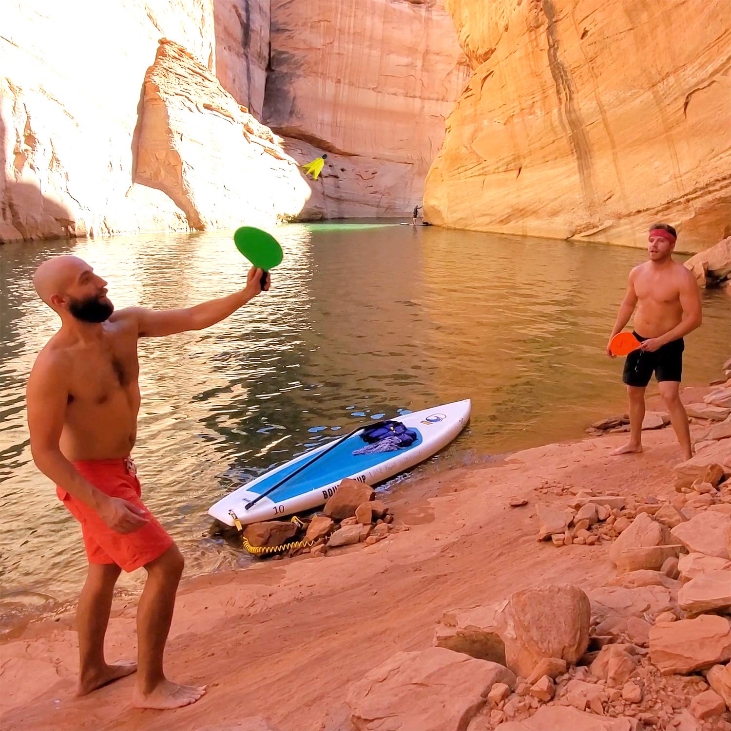 - FULL SET INCLUDES: 2 fluorescent wooden paddles, 1 ball and 4 birdies; 2 red birdies for slow play, 2 yellow for fast and a durable carry bag. Jazzminton paddle game is an exciting, fast paced outdoor game for kids and adults. Get outdoors with Jazzminton and have a blast