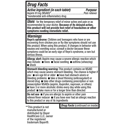 - Relieves Minor Aches and Pain: Low dose aspirin relieves minor to moderate pain and inflammation. It is a non-steroidal anti-inflammatory which can effectively reduce inflammation and its painful symptoms.