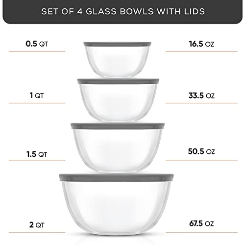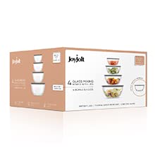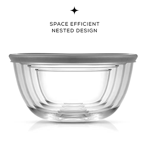 • Durable Bowls That Nest With Ease: When it comes to glass mixing bowls you want them sturdy thick clear and space saving right? If so you’ll probably love these four thick strong mixing bowls with lids They neatly nest for easy compact storage and tough enough for life! Cook for Joy by JoyJolt.