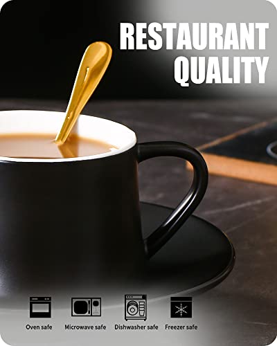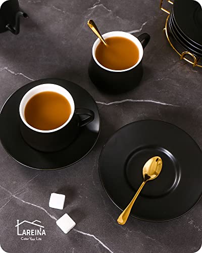 Lareina Porcelain Cappuccino Cups with Saucers, Spoons and Cup Stand – 7 Ounce Ceramic Coffee Cups for Americano, Latte, Cafe Mocha and Tea – Set of 6, Black